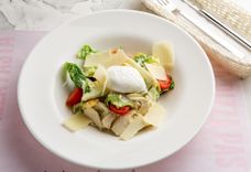 Паста, тунец консервированный, маслины, томаты, перец сладкий, лук красный, яйцо перепелиное, майонез