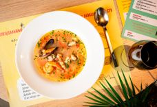 судак, лосось, морской коктейль, мидии, креветки, картофель, морковь, лук , чеснок, лимон, лавровый лист, томаты в собственном соку, масло оливковое, орегано, петрушка