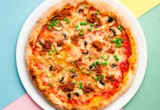 соус помодоро, моцарелла, рагу болоньезе, шампиньоны, зеленый гороршек.