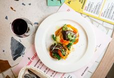 Щеки говяжьи в соусе деми-гласс, картофельное пюре, перец сладкий, брокколи, оливковое масло, укроп