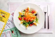 Салат с лососем, яйцом и свежими овощами