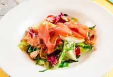 Артишоки, ромен, руккола, фризе, радичио, сыр Камамбер, томаты черри, пармская ветчина, оливки черные, заправка с бальзамическим уксусом