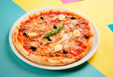 Соус помодоро, Тунец, Каперсы, Маслины, Лук, Чеснок, Оливковое масло.