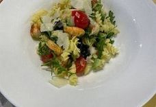 Паста, креветки, авокадо, томаты черри, маслины, руккола, лук красный, масло оливковое, пармезан, соус песто